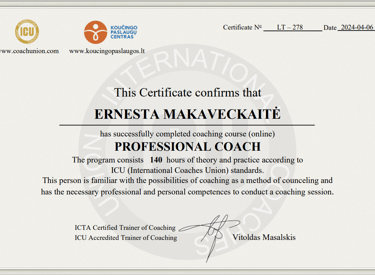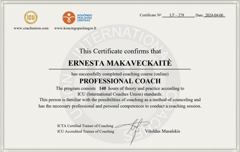 Nuolat investuoju į savo kompetencijų plėtimą, nes tikiu – tik augantis specialistas gali vesti kitus transformacijos keliu. Mano žinios ir metodai nuolat gilinami.